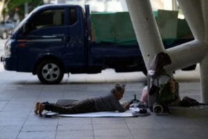 สถานที่พักพิงของชาวปาเลสไตน์ที่ต้องอพยพ เมืองข่านยูนิส ทางตอนใต้ของฉนวนกาซา เมื่อวันที่ 6 ตุลาคม 2024 เนื่องในโอกาสครบรอบสงครามที่กำลังดำเนินอยู่ในดินแดนปาเลสไตน์ระหว่างอิสราเอลและฮามาส (เอเอฟพี)