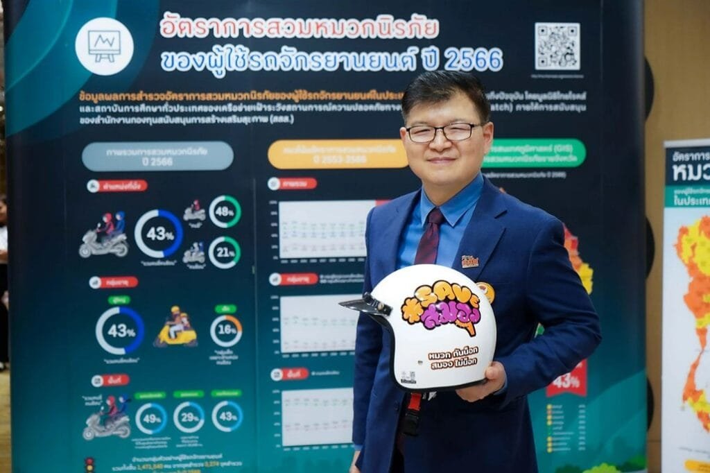 สำหรับการแถลงผลสำรวจอัตราการสวมหมวกนิรภัยของผู้ใช้รถจักรยานยนต์ ปี 2566 ที่ผ่านมา มีข้อมูลจากมูลนิธิไทยโรดส์ และเครือข่ายเฝ้าระวังสถานการณ์ความปลอดภัยทางถนน (Road Safety Watch) จากการสำรวจพฤติกรรมการสวมหมวกนิรภัยของผู้ใช้รถจักรยานยนต์ ตั้งแต่ปี 2553 ถึง ปี 2566 น่าสนใจที่จะสามารถใช้เป็นข้อมูลพื้นฐานเพื่อต่อยอดและขับเคลื่อนอย่างมีทิศทางต่อไป โดย คุณณัฐพงศ์ บุญตอบ กรรมการและผู้ช่วยเลขานุการมูลนิธิไทยโรดส์ เปิดเผยว่า ภาพรวมของประเทศ มีผู้ใช้รถจักรยานยนต์สวมหมวกนิรภัยเพียง 43% แบ่งเป็นคนขี่และคนซ้อนที่สวมหมวกนิรภัย 48% และ 21% ตามลำดับ
