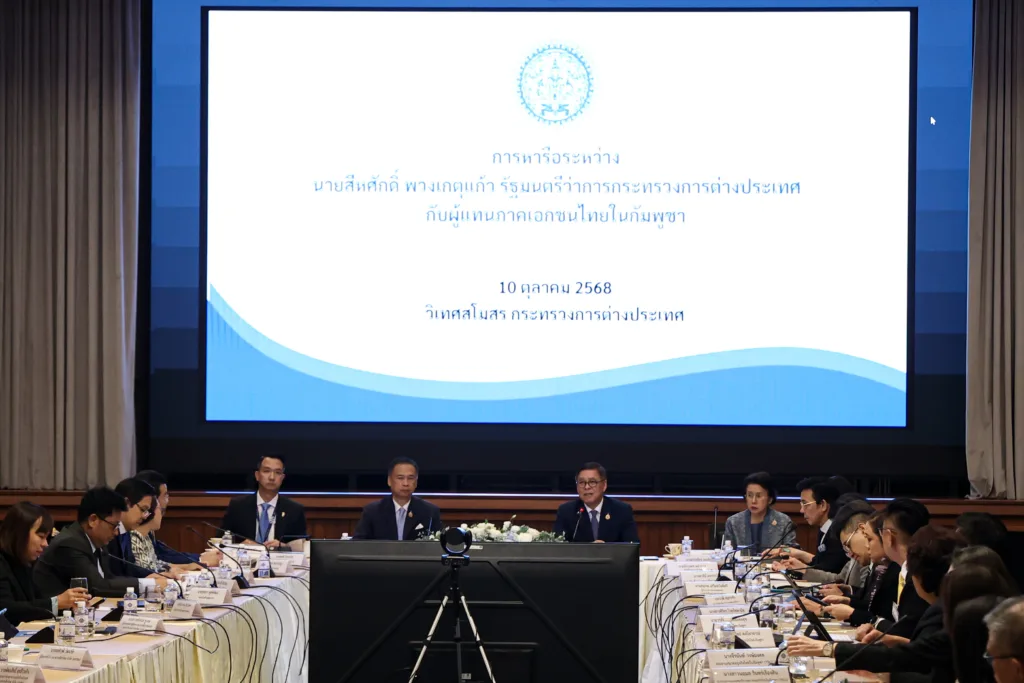 เมื่อเวลา 14.30 น.วันที่ 10 ต.ค.68 ที่กระทรวงการต่างประเทศ นายสีหศักดิ์ พวงเกตุแก้ว รัฐมนตรีว่าการกระทรวงการต่างประเทศ ได้เข้าร่วมการประชุมร่วมกับผู้แทนภาคเอกชนไทยในประเทศกัมพูชา โดยได้กล่าวเปิดการประชุมด้วยการแสดงจุดยืนที่ชัดเจนของรัฐบาลไทยเกี่ยวกับสถานการณ์ความสัมพันธ์ระหว่างไทยและกัมพูชาในช่วงที่ผ่านมา โดยเฉพาะในประเด็นด้านความมั่นคงและการเมืองระหว่างประเทศ