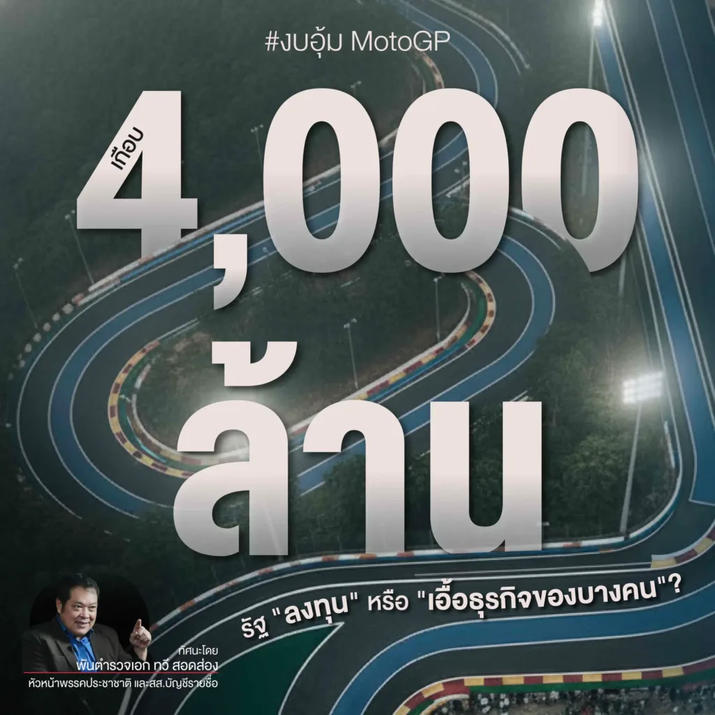 พ.ต.อ.ทวี สอดส่อง เปิดข้อมูลรัฐบาลอนุทิน อนุมัติงบเกือบ 4 พันล้านจัด MotoGP 5 ปี ใช้สนามช้างฯ บุรีรัมย์ ของกลุ่มธุรกิจใกล้ชิด ตั้งข้อสงสัยการเอื้อพวกพ้องและขาดธรรมาภิบาล