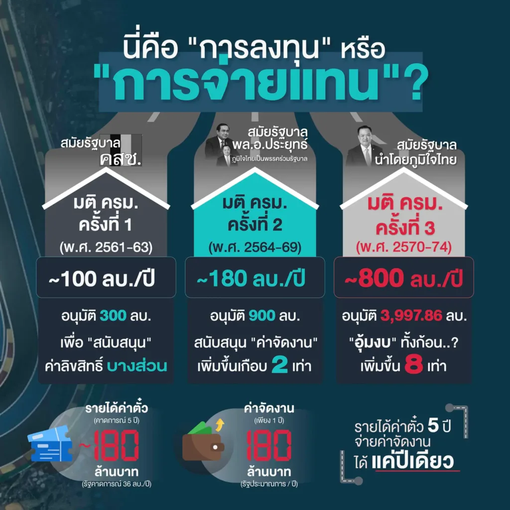 เขายังชี้ด้วยว่า งบดังกล่าวยังรวม “ค่าภาษี” กว่า 780 ล้านบาท ที่รัฐต้องจ่ายแทนภาคเอกชน ซึ่งเป็นการใช้เงินภาษีของประชาชนสนับสนุนธุรกิจที่เชื่อมโยงกับผู้มีอำนาจในปัจจุบัน โดยอ้างว่าเพื่อ “ส่งเสริมการท่องเที่ยว” ทั้งที่ผลประโยชน์อาจกลับไปยังกลุ่มทุนเดิม