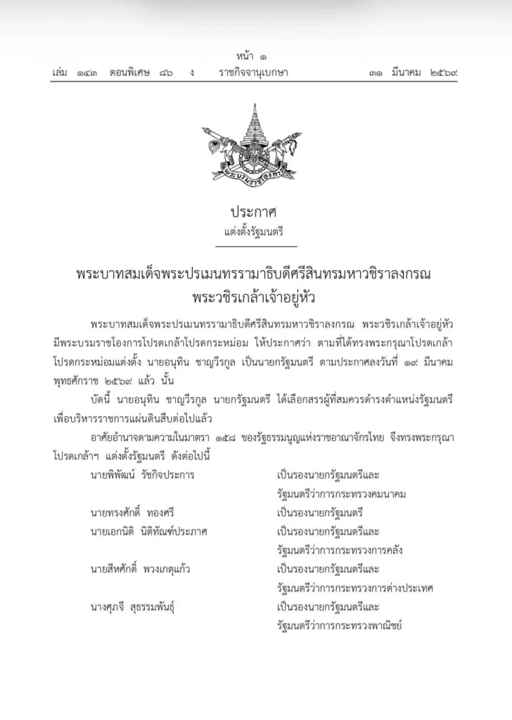ราชกิจจาฯ เผยแพร่พระบรมราชโองการ โปรดเกล้าฯ แต่งตั้งคณะรัฐมนตรีนายอนุทิน ชาญวีรกูล แล้ว ทั้งนี้ตั้งแต่บัดนี้เป็นต้นไป ประกาศ ณ วันที่ 30 มีนาคม 2569