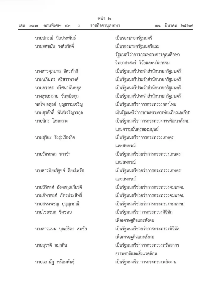 วันที่ 31 มีนาคม 2569 เวลา 09.24 น. เว็บไซต์ราชกิจจานุเบกษา ประกาศแต่งตั้งรัฐมนตรี ความว่า